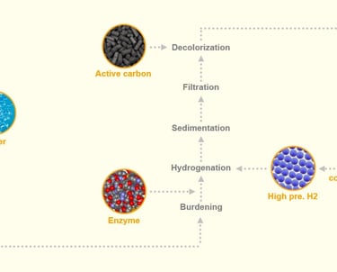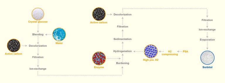 The glucose solution is hydrolysed inside the reactor. The raw sorbitol solution is then purified using ion-exchange and evaporated to the final concentration.